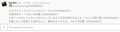 Slack上でアニメの名言を引用したい時に、スラッシュコマンドで一覧を表示できるkotoha-slackを作りました。 コードはGithubにあります。 github.com