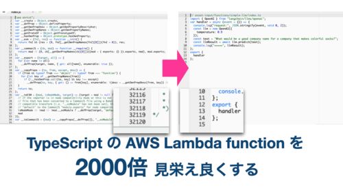 AWS Lambda Advent Calendar 13日目の記事です。 qiita.com 今回は AWS Lambda function で TypeScript の 関数を書くときにコンソール上で2000倍(※当社比)見栄え良くする方法を書きます。 ちなみにここでの"見栄えの良さ"はAWS コンソール上での読みさすさ…